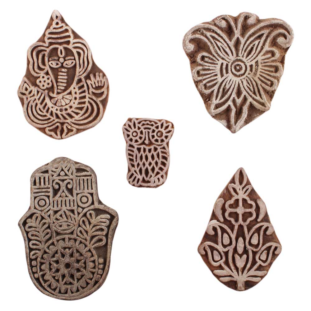 Set of 5 Piece New Mix Wooden Printing Blocks. Ideal for use on Fabric, Paper, Canvas, etc. These Blocks can be use to Print with Oil Colors, Fabric Colors, Water Colors, Acrylic Colors and Vegetable Colors.