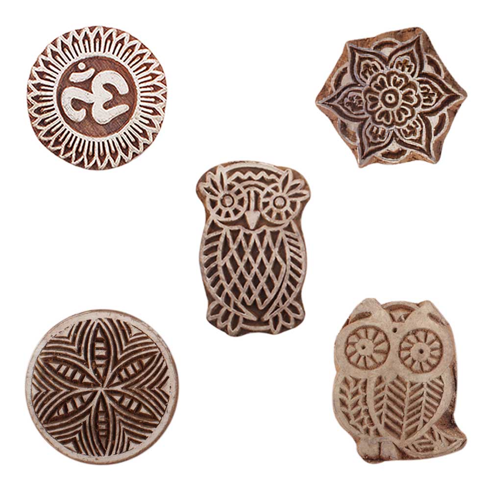Set of 5 Piece New Mix Wooden Printing Blocks. Ideal for use on Fabric, Paper, Canvas, etc. These Blocks can be use to Print with Oil Colors, Fabric Colors, Water Colors, Acrylic Colors and Vegetable Colors.