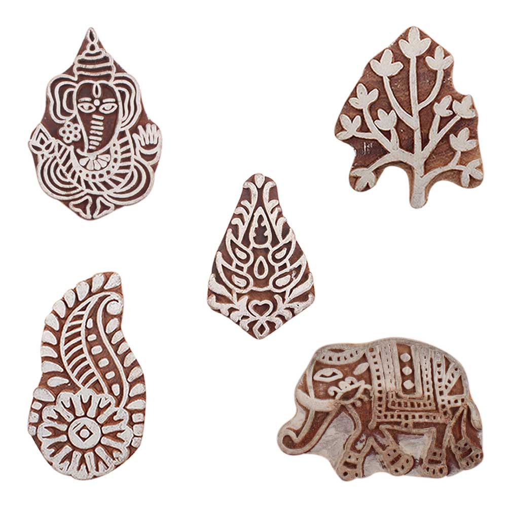 Set of 5 Piece New Mix Wooden Printing Blocks. Ideal for use on Fabric, Paper, Canvas, etc. These Blocks can be use to Print with Oil Colors, Fabric Colo