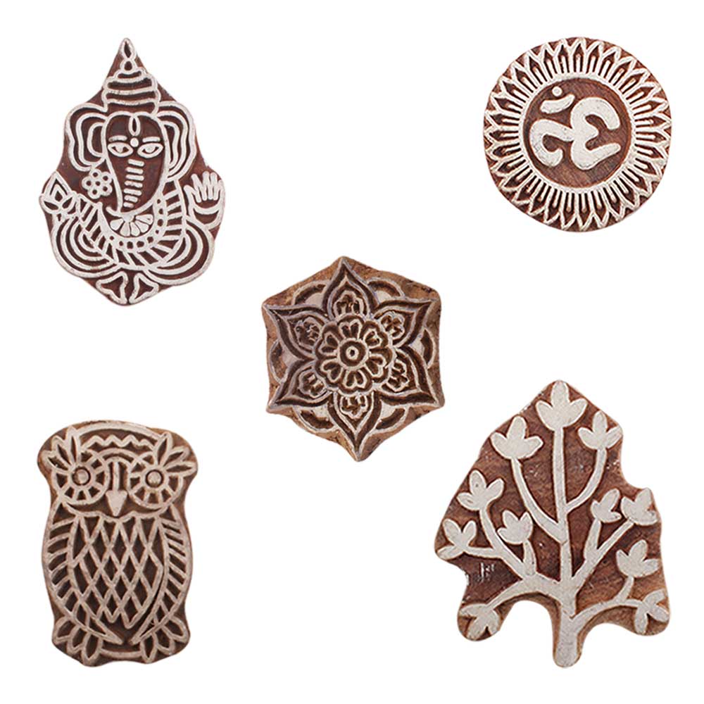 Set of 5 Piece New Mix Wooden Printing Blocks. Ideal for use on Fabric, Paper, Canvas, etc. These Blocks can be use to Print with Oil Colors, Fabric Colors, Water Colors, Acrylic Colors and Vegetable Colors.