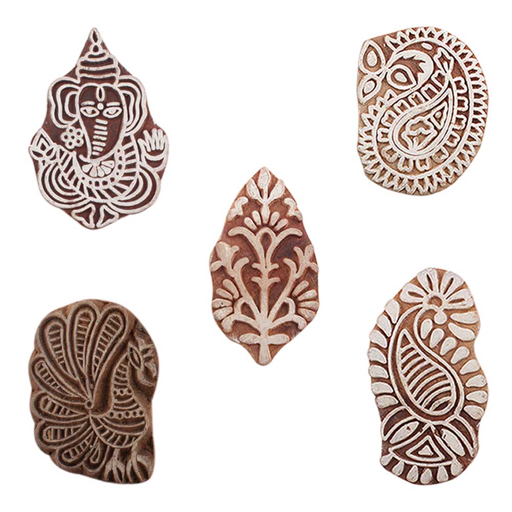 Set of 5 Piece New Mix Wooden Printing Blocks. Ideal for use on Fabric, Paper, Canvas, etc. These Blocks can be use to Print with Oil Colors, Fabric Colors, Water Colors, Acrylic Colors and Vegetable Colors.