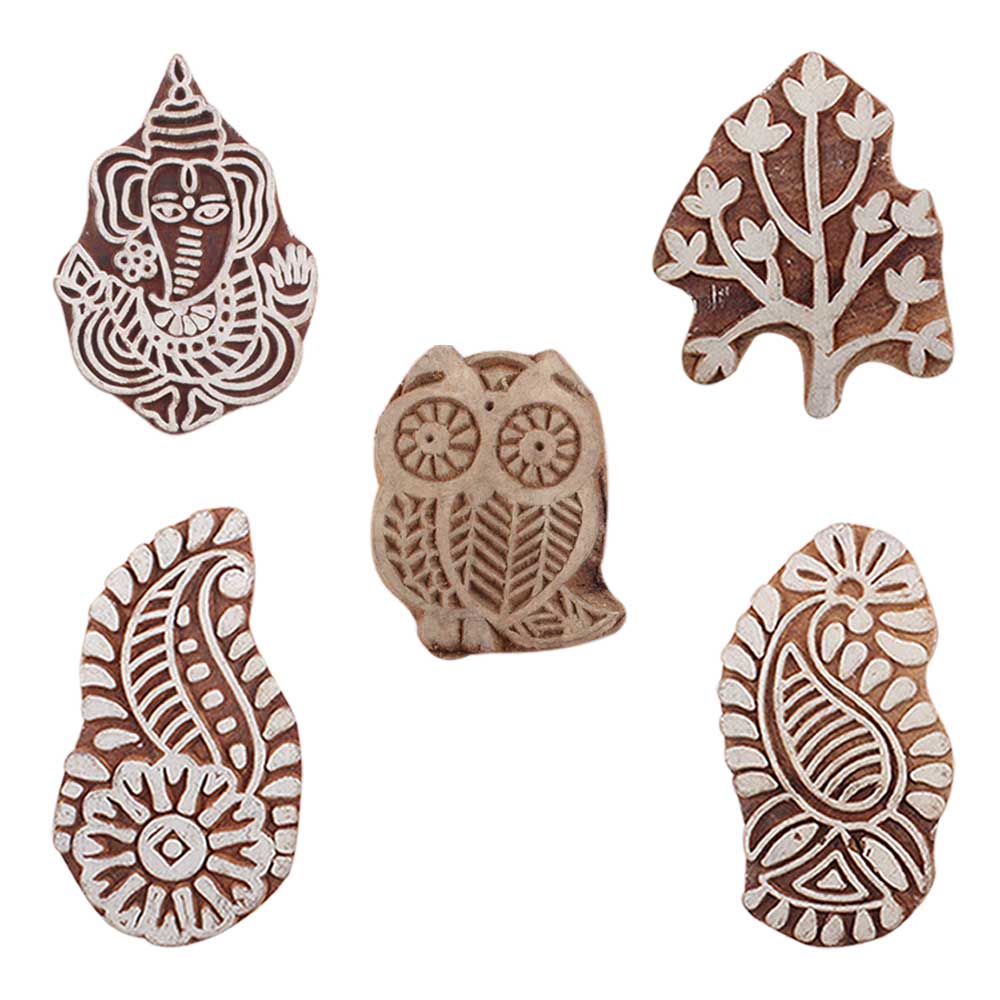 Set of 5 Piece New Mix Wooden Printing Blocks. Ideal for use on Fabric, Paper, Canvas, etc. These Blocks can be use to Print with Oil Colors, Fabric Colors, Water Colors, Acrylic Colors and Vegetable Colors.