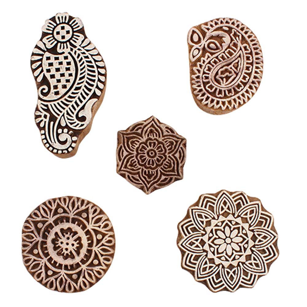 Set of 5 Piece New Mix Wooden Printing Blocks. Ideal for use on Fabric, Paper, Canvas, etc. These Blocks can be use to Print with Oil Colors, Fabric Colors, Water Colors, Acrylic Colors and Vegetable Colors.