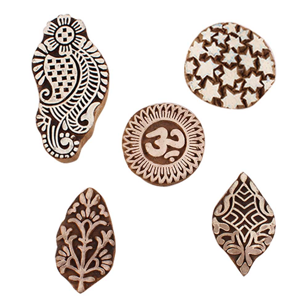 Set of 5 Piece New Mix Wooden Printing Blocks. Ideal for use on Fabric, Paper, Canvas, etc. These Blocks can be use to Print with Oil Colors, Fabric Colors, Water Colors, Acrylic Colors and Vegetable Colors.
