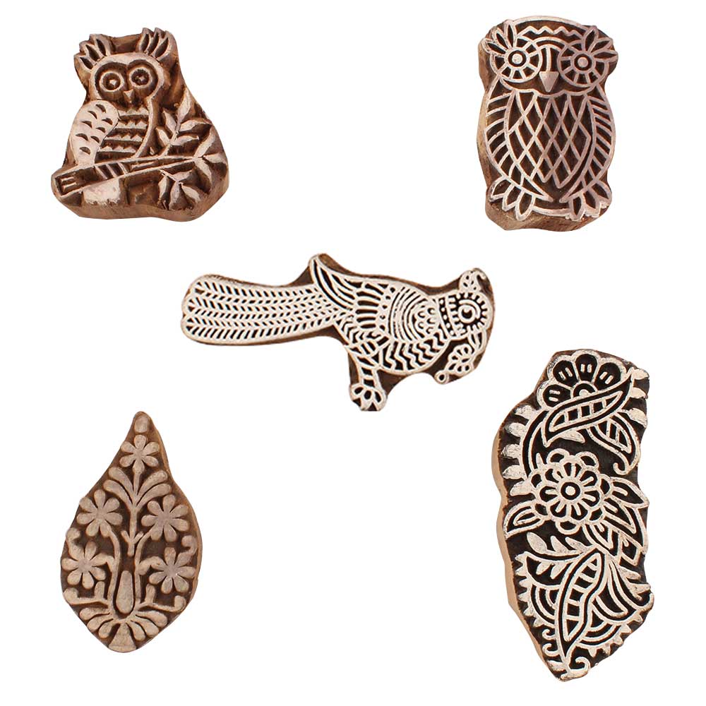 Set of 5 Piece New Mix Wooden Printing Blocks. Ideal for use on Fabric, Paper, Canvas, etc. These Blocks can be use to Print with Oil Colors, Fabric Colors, Water Colors, Acrylic Colors and Vegetable Colors.