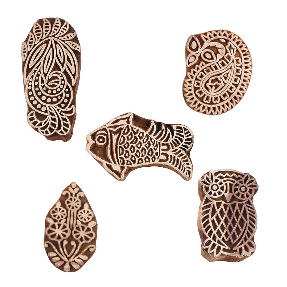 Set of 5 Piece New Mix Wooden Printing Blocks. Ideal for use on Fabric, Paper, Canvas, etc. These Blocks can be use to Print with Oil Colors, Fabric Colors, Water Colors, Acrylic Colors and Vegetable Colors.