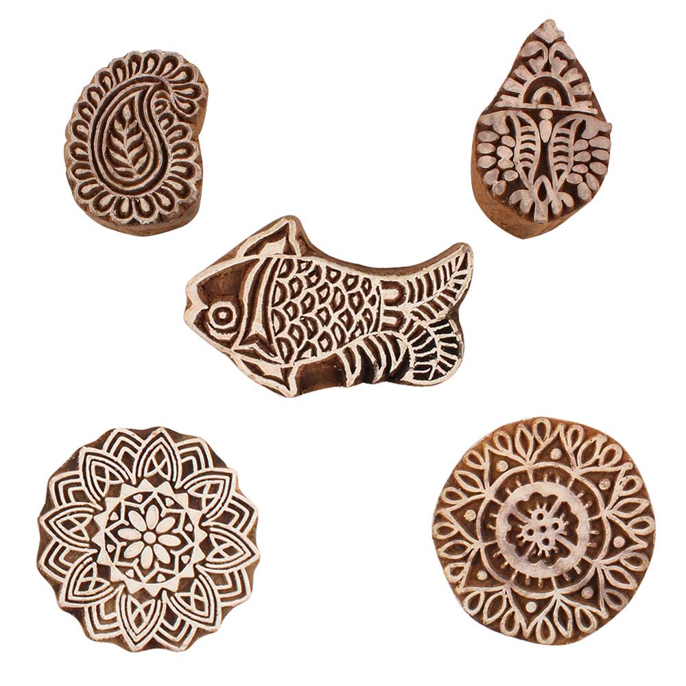 Set of 5 Piece New Mix Wooden Printing Blocks. Ideal for use on Fabric, Paper, Canvas, etc. These Blocks can be use to Print with Oil Colors, Fabric Colors, Water Colors, Acrylic Colors and Vegetable Colors.