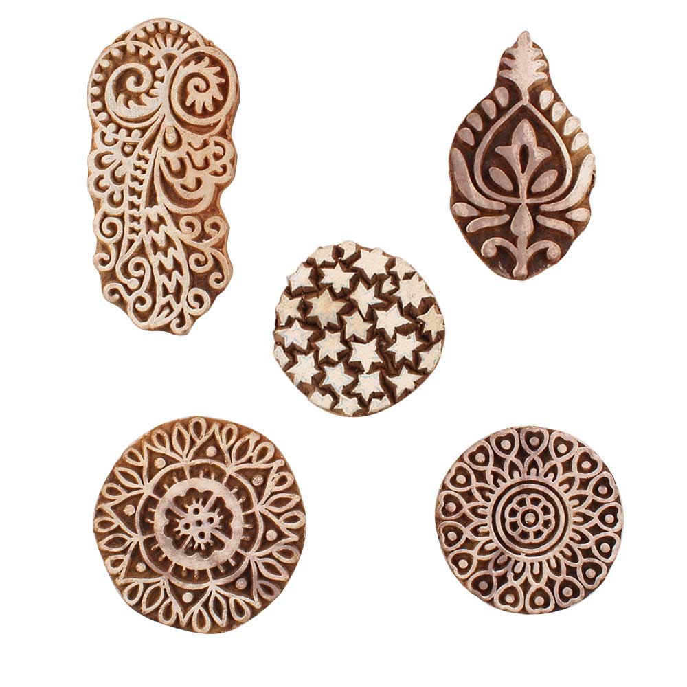 Set of 5 Piece New Mix Wooden Printing Blocks. Ideal for use on Fabric, Paper, Canvas, etc. These Blocks can be use to Print with Oil Colors, Fabric Colors, Water Colors, Acrylic Colors and Vegetable Colors.