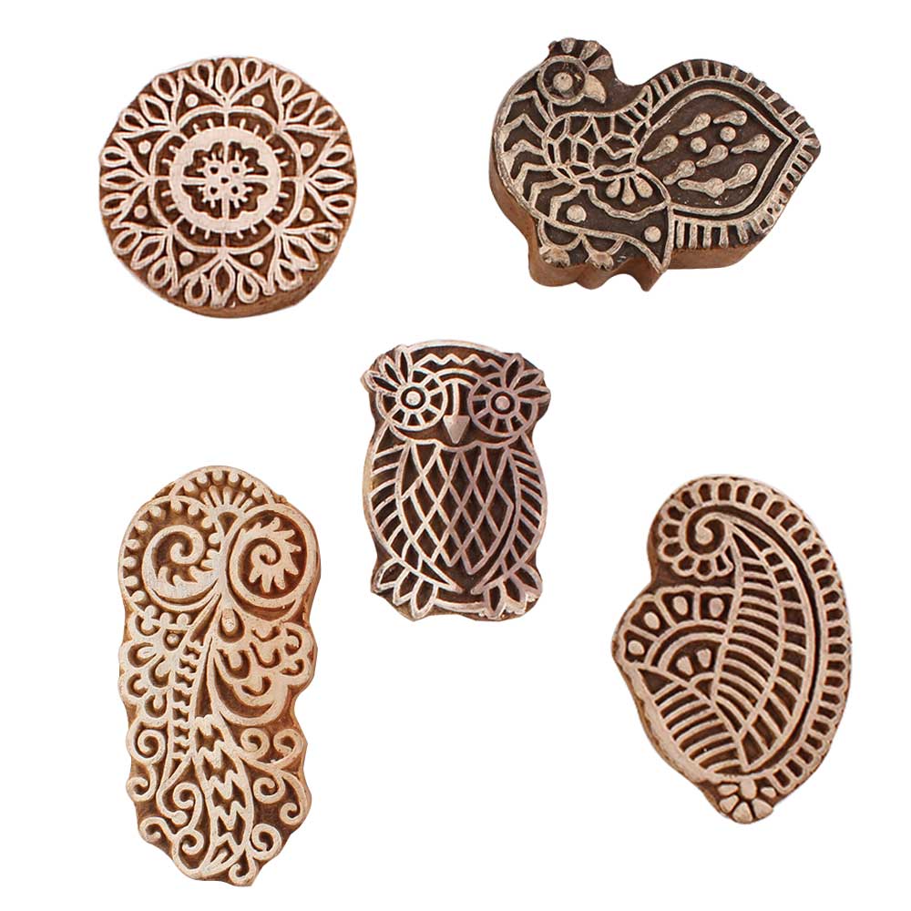 Set of 5 Piece New Mix Wooden Printing Blocks. Ideal for use on Fabric, Paper, Canvas, etc. These Blocks can be use to Print with Oil Colors, Fabric Colors, Water Colors, Acrylic Colors and Vegetable Colors.