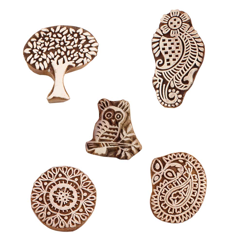 Set of 5 Piece New Mix Wooden Printing Blocks. Ideal for use on Fabric, Paper, Canvas, etc. These Blocks can be use to Print with Oil Colors, Fabric Colors, Water Colors, Acrylic Colors and Vegetable Colors.