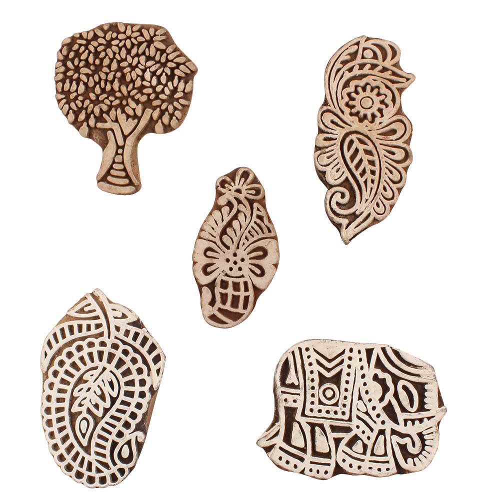 Set of 5 Piece New Mix Wooden Printing Blocks. Ideal for use on Fabric, Paper, Canvas, etc. These Blocks can be use to Print with Oil Colors, Fabric Colors, Water Colors, Acrylic Colors and Vegetable Colors.