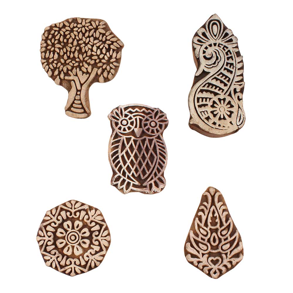 Set of 5 Piece New Mix Wooden Printing Blocks. Ideal for use on Fabric, Paper, Canvas, etc. These Blocks can be use to Print with Oil Colors, Fabric Colors, Water Colors, Acrylic Colors and Vegetable Colors.