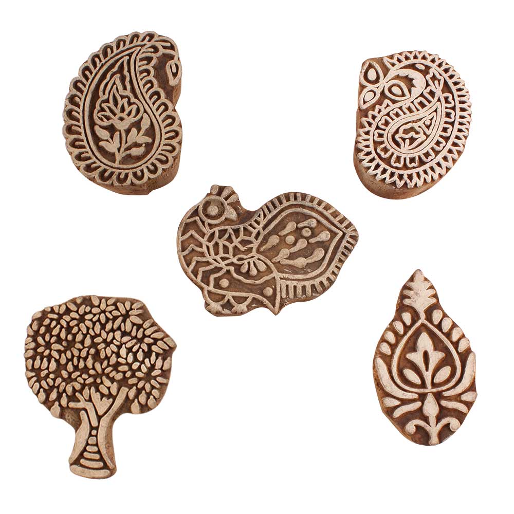 Set of 5 Piece New Mix Wooden Printing Blocks. Ideal for use on Fabric, Paper, Canvas, etc. These Blocks can be use to Print with Oil Colors, Fabric Colors, Water Colors, Acrylic Colors and Vegetable Colors.