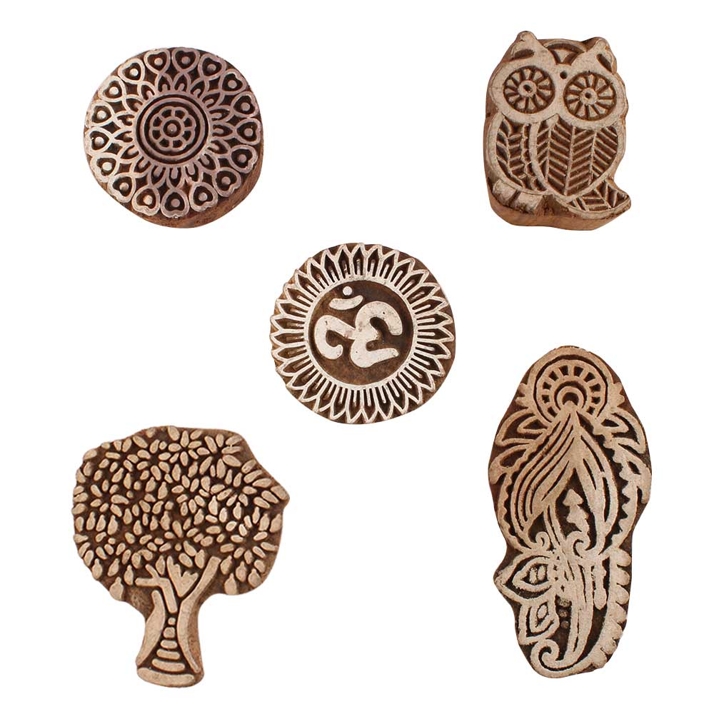 Set of 5 Piece New Mix Wooden Printing Blocks. Ideal for use on Fabric, Paper, Canvas, etc. These Blocks can be use to Print with Oil Colors, Fabric Colors, Water Colors, Acrylic Colors and Vegetable Colors.