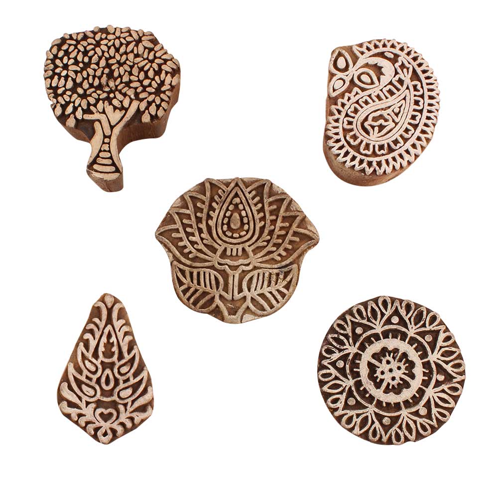 Set of 5 Piece New Mix Wooden Printing Blocks. Ideal for use on Fabric, Paper, Canvas, etc. These Blocks can be use to Print with Oil Colors, Fabric Colors, Water Colors, Acrylic Colors and Vegetable Colors.