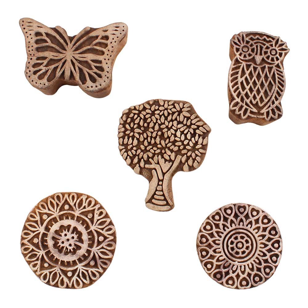 Set of 5 Piece New Mix Wooden Printing Blocks. Ideal for use on Fabric, Paper, Canvas, etc. These Blocks can be use to Print with Oil Colors, Fabric Colors, Water Colors, Acrylic Colors and Vegetable Colors.