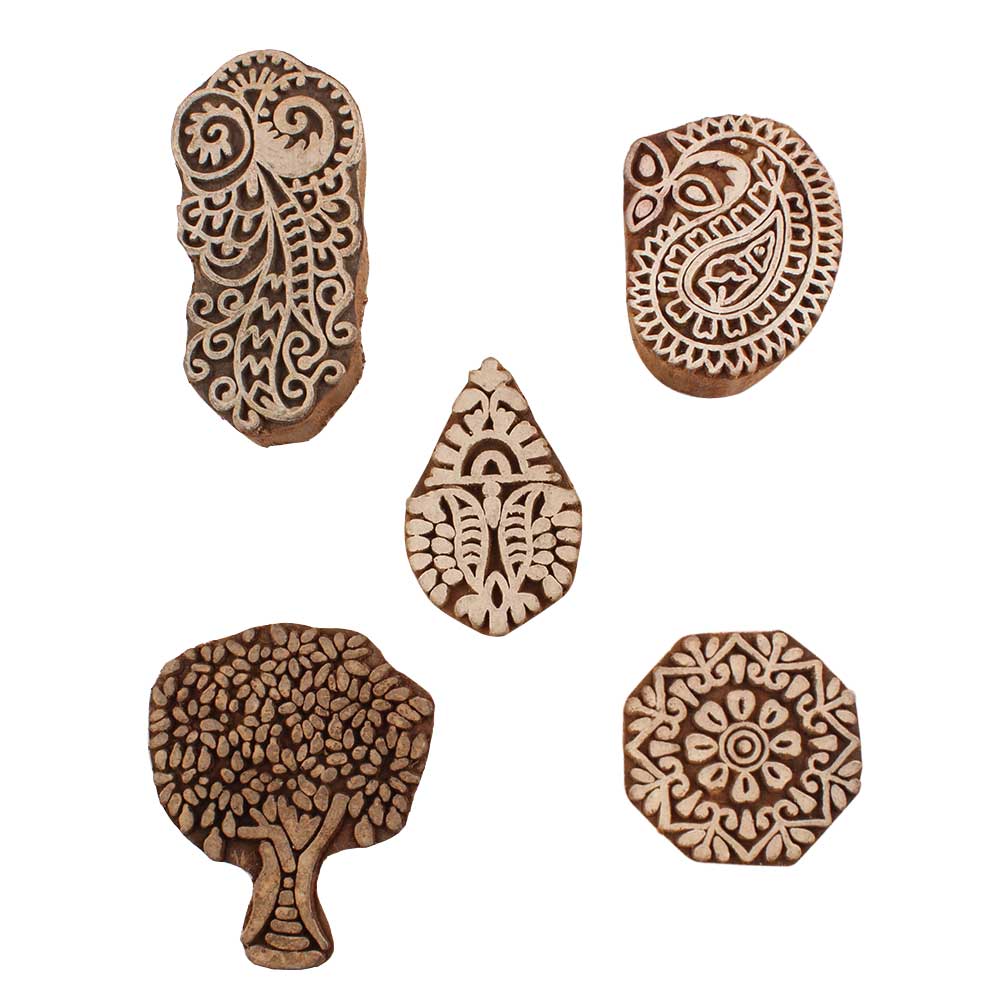 Set of 5 Piece New Mix Wooden Printing Blocks. Ideal for use on Fabric, Paper, Canvas, etc. These Blocks can be use to Print with Oil Colors, Fabric Colors, Water Colors, Acrylic Colors and Vegetable Colors.