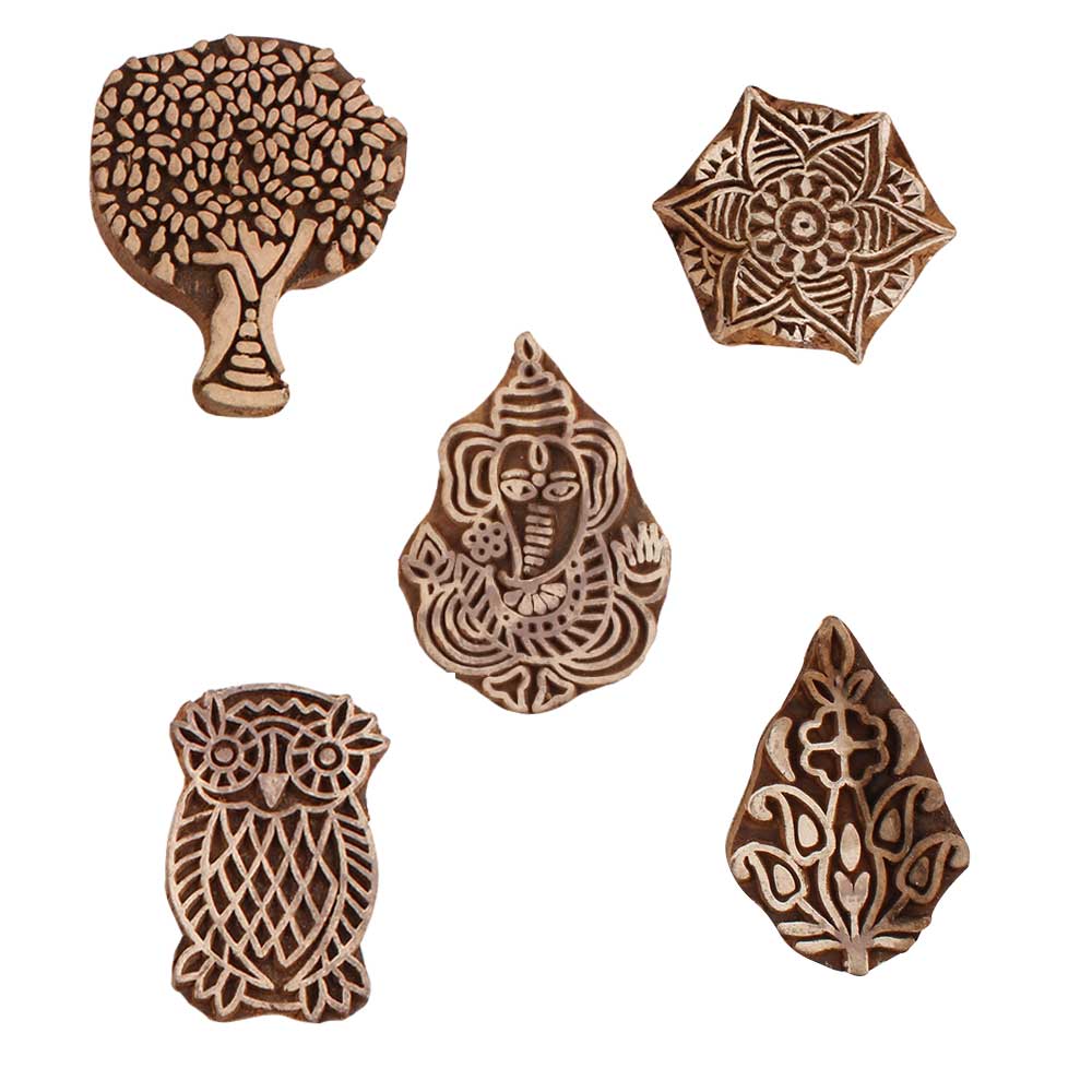 Set of 5 Piece New Mix Wooden Printing Blocks. Ideal for use on Fabric, Paper, Canvas, etc. These Blocks can be use to Print with Oil Colors, Fabric Colors, Water Colors, Acrylic Colors and Vegetable Colors.