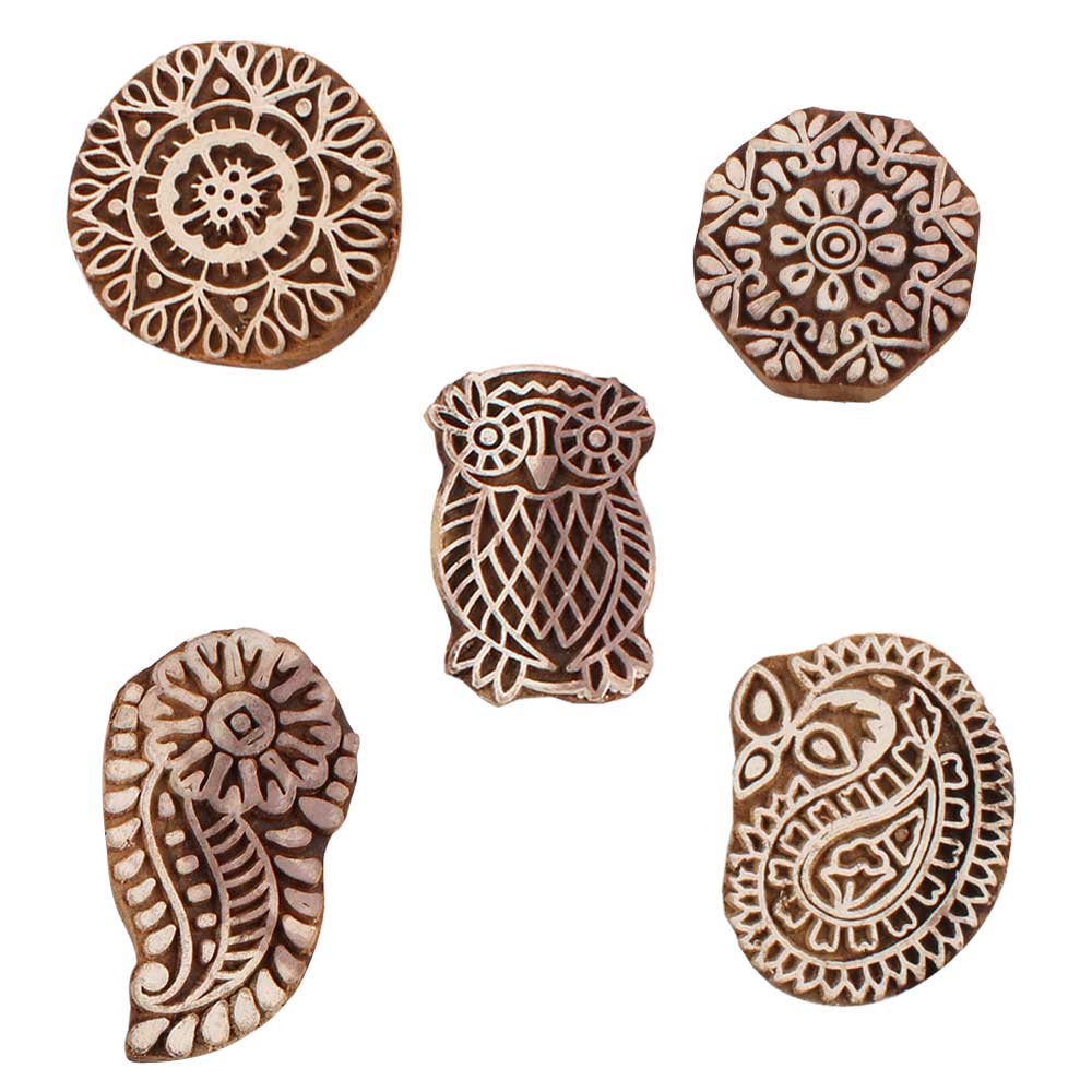 Set of 5 Piece New Mix Wooden Printing Blocks. Ideal for use on Fabric, Paper, Canvas, etc. These Blocks can be use to Print with Oil Colors, Fabric Colors, Water Colors, Acrylic Colors and Vegetable Colors.