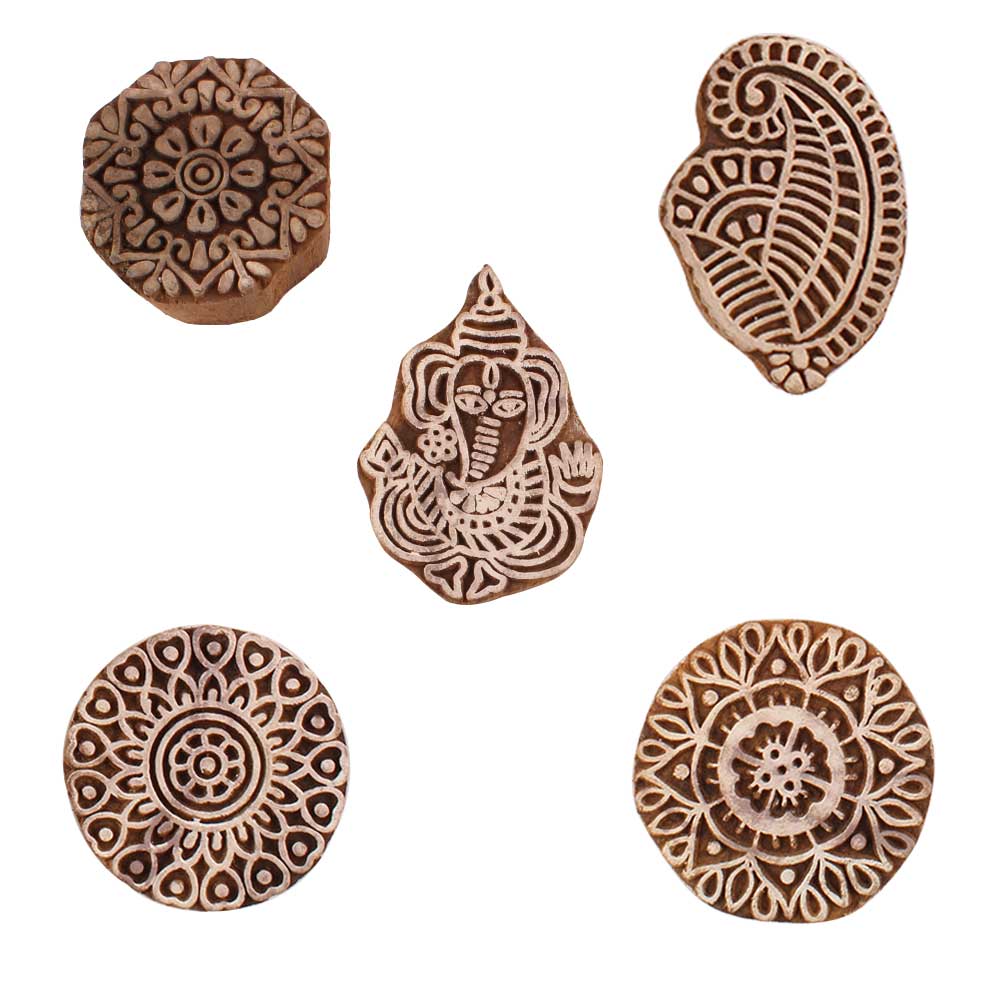 Set of 5 Piece New Mix Wooden Printing Blocks. Ideal for use on Fabric, Paper, Canvas, etc. These Blocks can be use to Print with Oil Colors, Fabric Colors, Water Colors, Acrylic Colors and Vegetable Colors.