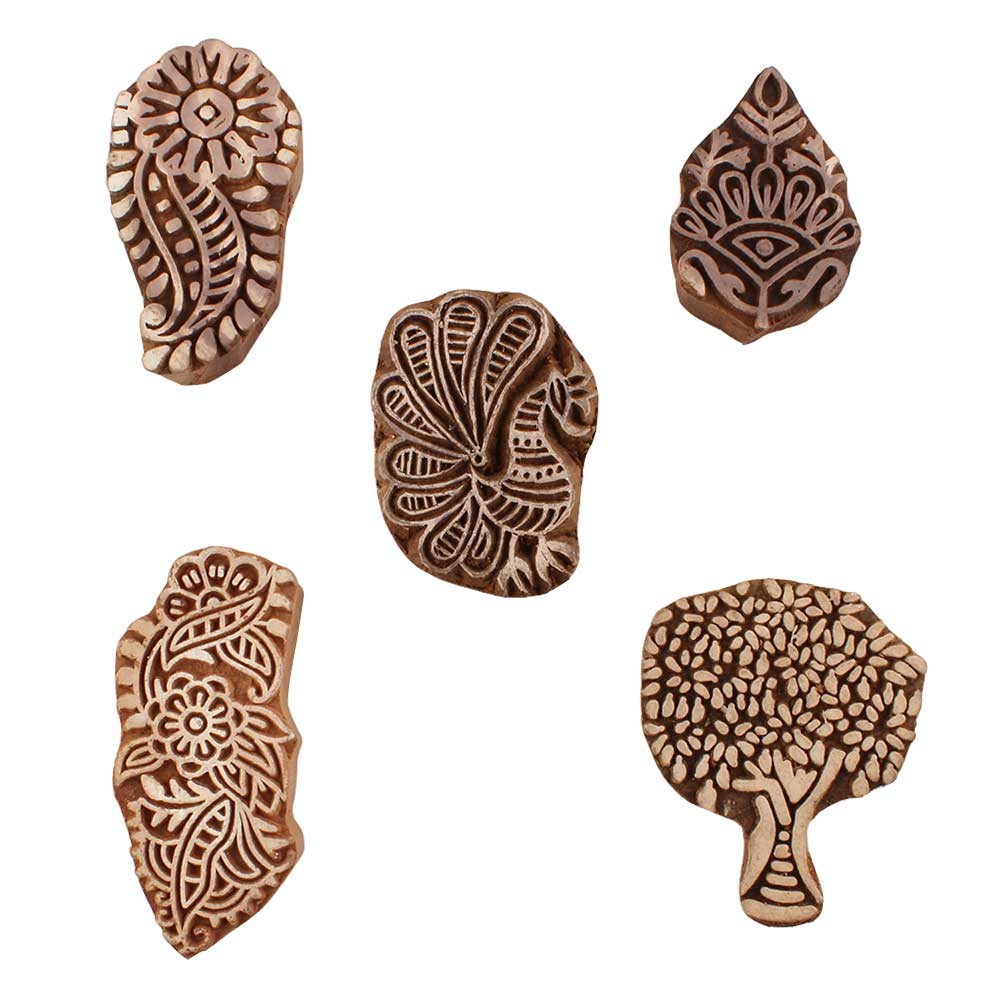 Set of 5 Piece New Mix Wooden Printing Blocks. Ideal for use on Fabric, Paper, Canvas, etc. These Blocks can be use to Print with Oil Colors, Fabric Colors, Water Colors, Acrylic Colors and Vegetable Colors.