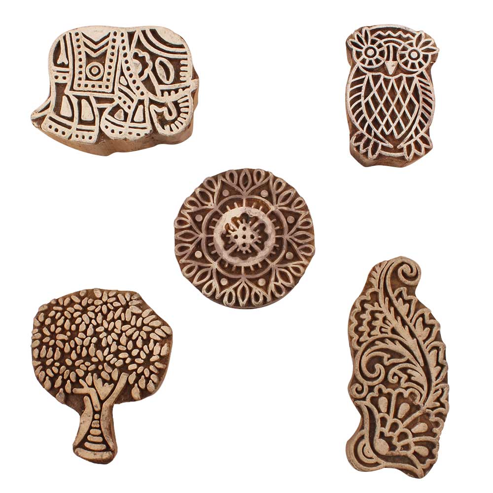 Set of 5 Piece New Mix Wooden Printing Blocks. Ideal for use on Fabric, Paper, Canvas, etc. These Blocks can be use to Print with Oil Colors, Fabric Colors, Water Colors, Acrylic Colors and Vegetable Colors.