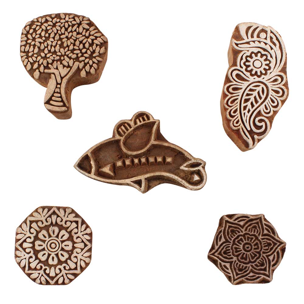 Set of 5 Piece New Mix Wooden Printing Blocks. Ideal for use on Fabric, Paper, Canvas, etc. These Blocks can be use to Print with Oil Colors, Fabric Colors, Water Colors, Acrylic Colors and Vegetable Colors.