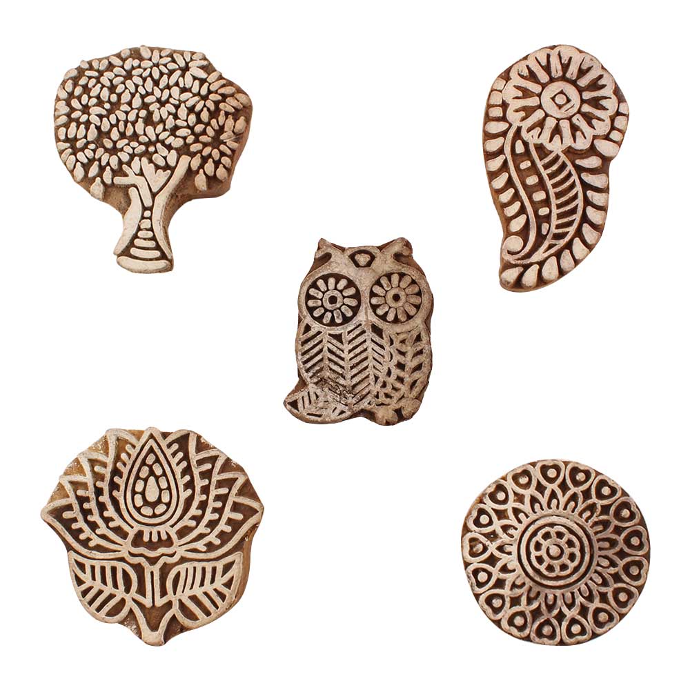 Set of 5 Piece New Mix Wooden Printing Blocks. Ideal for use on Fabric, Paper, Canvas, etc. These Blocks can be use to Print with Oil Colors, Fabric Colors, Water Colors, Acrylic Colors and Vegetable Colors.