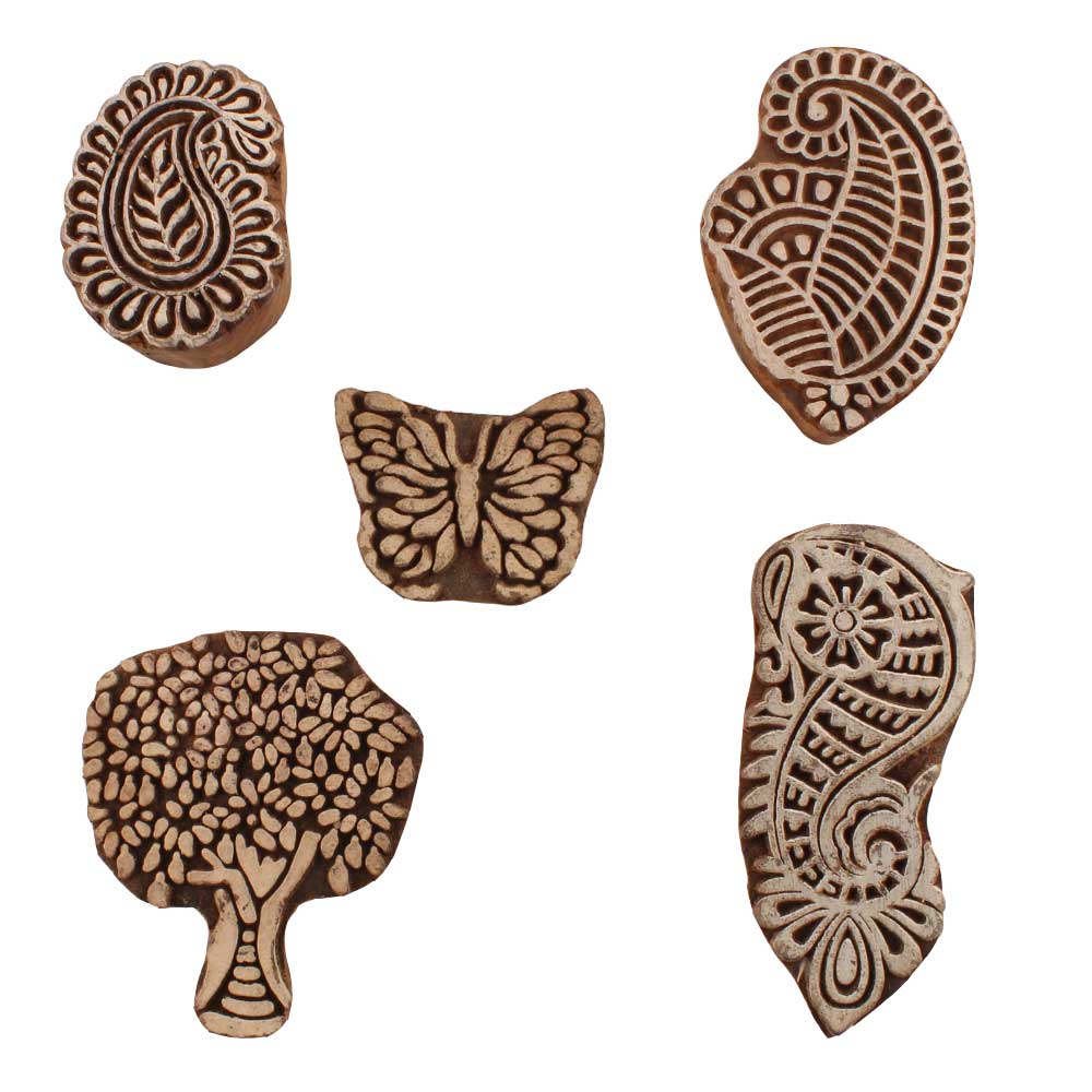 Set of 5 Piece New Mix Wooden Printing Blocks. Ideal for use on Fabric, Paper, Canvas, etc. These Blocks can be use to Print with Oil Colors, Fabric Colors, Water Colors, Acrylic Colors and Vegetable Colors.