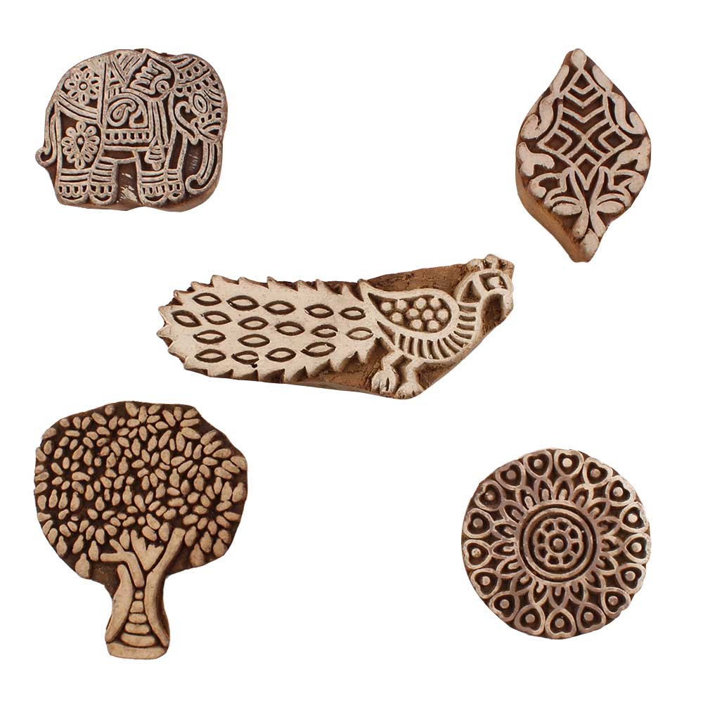Set of 5 Piece New Mix Wooden Printing Blocks. Ideal for use on Fabric, Paper, Canvas, etc. These Blocks can be use to Print with Oil Colors, Fabric Colors, Water Colors, Acrylic Colors and Vegetable Colors.