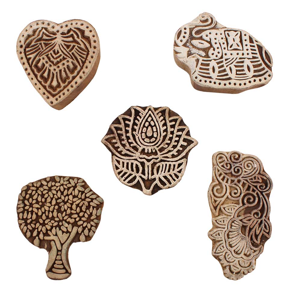 Set of 5 Piece New Mix Wooden Printing Blocks. Ideal for use on Fabric, Paper, Canvas, etc. These Blocks can be use to Print with Oil Colors, Fabric Colors, Water Colors, Acrylic Colors and Vegetable Colors.