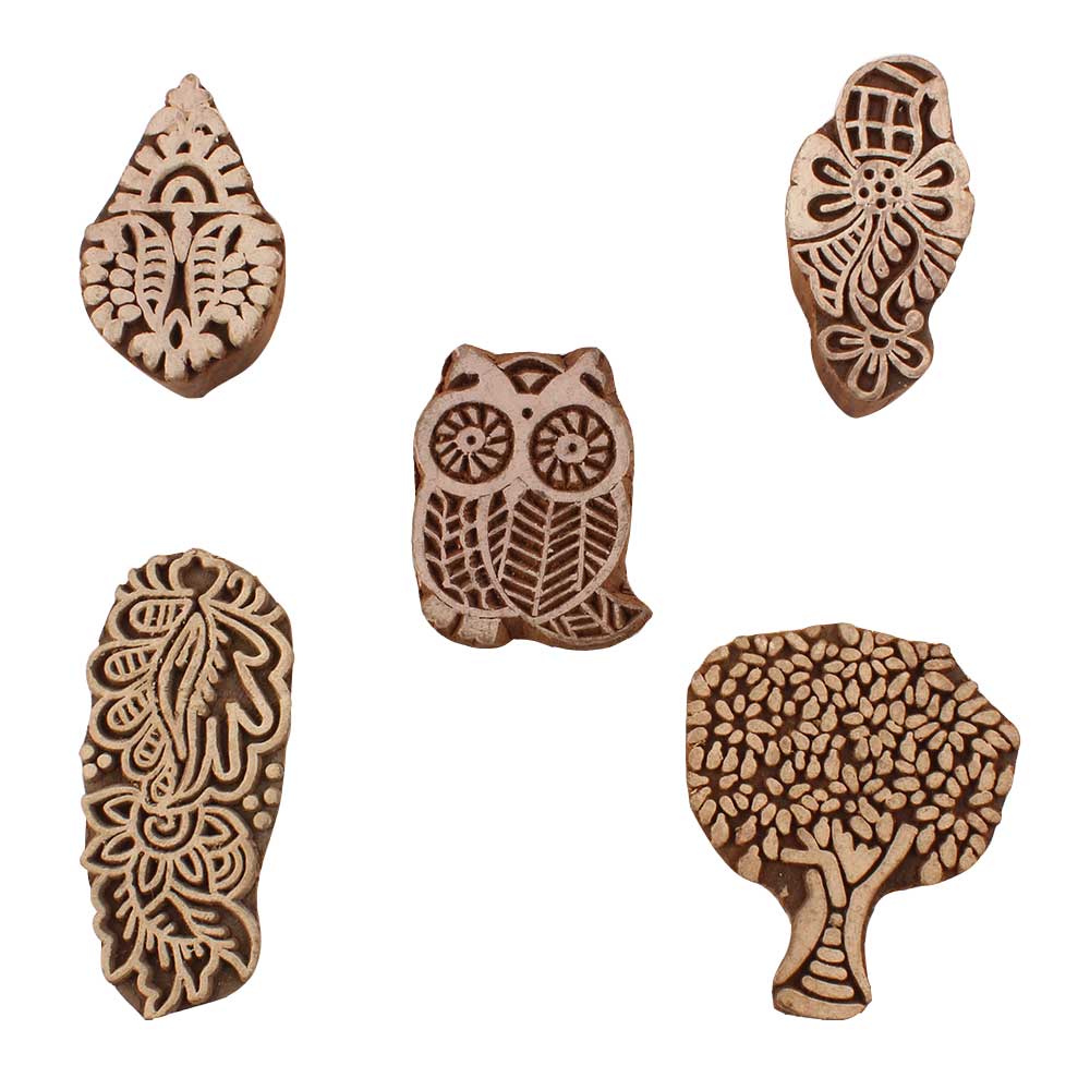 Set of 5 Piece New Mix Wooden Printing Blocks. Ideal for use on Fabric, Paper, Canvas, etc. These Blocks can be use to Print with Oil Colors, Fabric Colors, Water Colors, Acrylic Colors and Vegetable Colors.