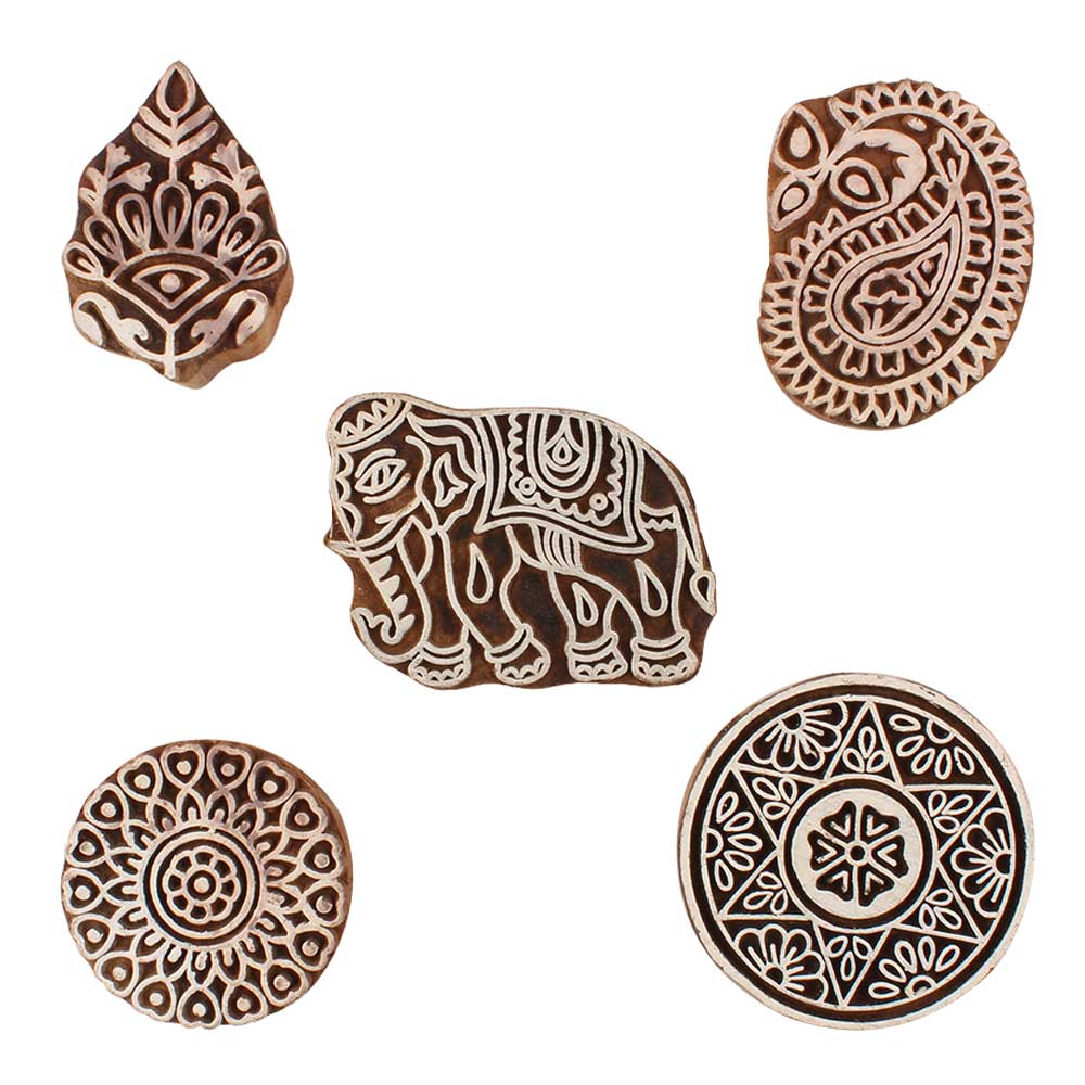 Set of 5 Piece New Mix Wooden Printing Blocks. Ideal for use on Fabric, Paper, Canvas, etc. These Blocks can be use to Print with Oil Colors, Fabric Colors, Water Colors, Acrylic Colors and Vegetable Colors.