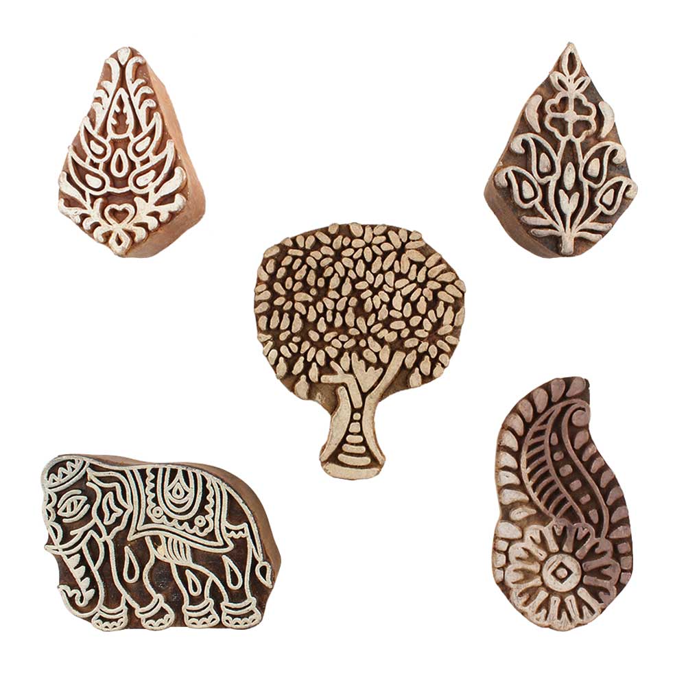 Set of 5 Piece New Mix Wooden Printing Blocks. Ideal for use on Fabric, Paper, Canvas, etc. These Blocks can be use to Print with Oil Colors, Fabric Colors, Water Colors, Acrylic Colors and Vegetable Colors.