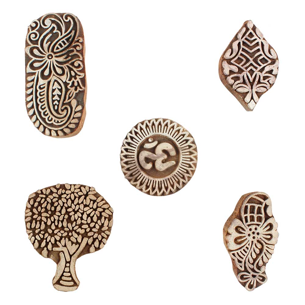 Set of 5 Piece New Mix Wooden Printing Blocks. Ideal for use on Fabric, Paper, Canvas, etc. These Blocks can be use to Print with Oil Colors, Fabric Colors, Water Colors, Acrylic Colors and Vegetable Colors.