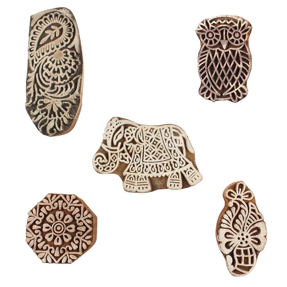 Set of 5 Piece New Mix Wooden Printing Blocks. Ideal for use on Fabric, Paper, Canvas, etc. These Blocks can be use to Print with Oil Colors, Fabric Colors, Water Colors, Acrylic Colors and Vegetable Colors.