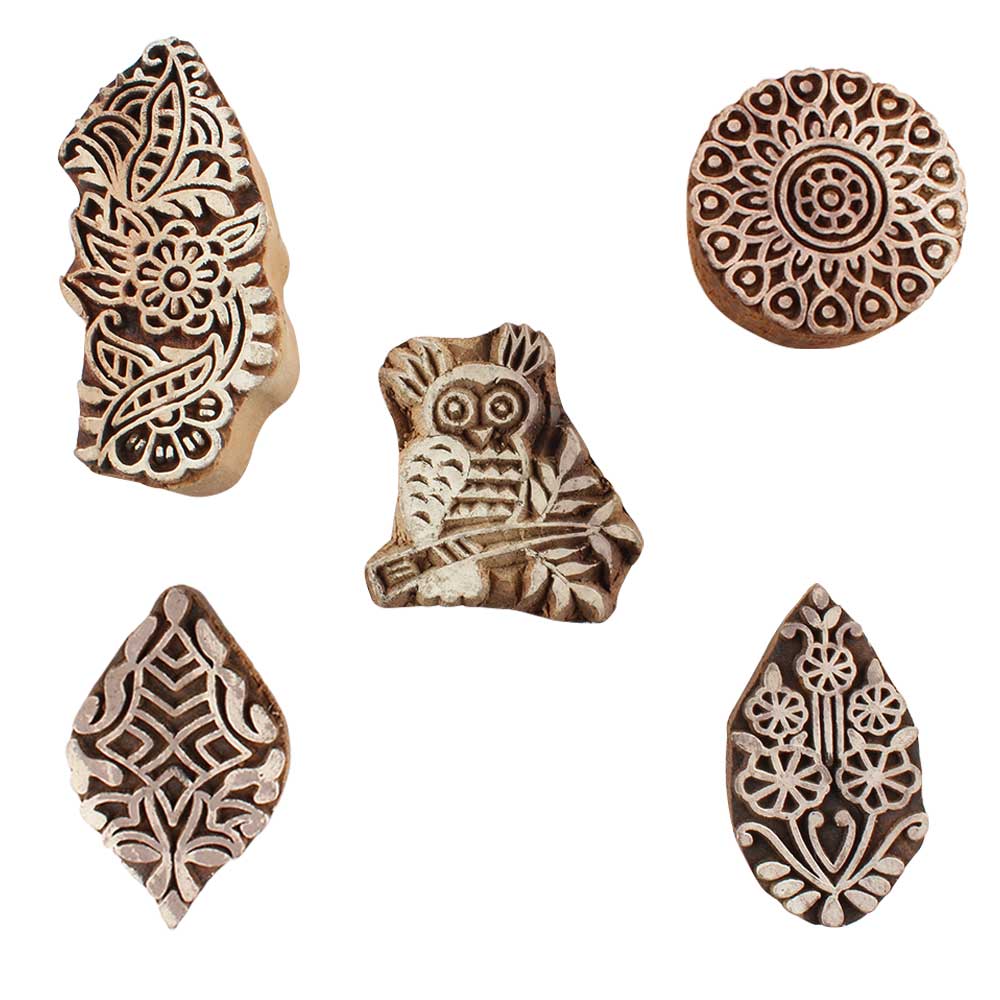 Set of 5 Piece New Mix Wooden Printing Blocks. Ideal for use on Fabric, Paper, Canvas, etc. These Blocks can be use to Print with Oil Colors, Fabric Colors, Water Colors, Acrylic Colors and Vegetable Colors.