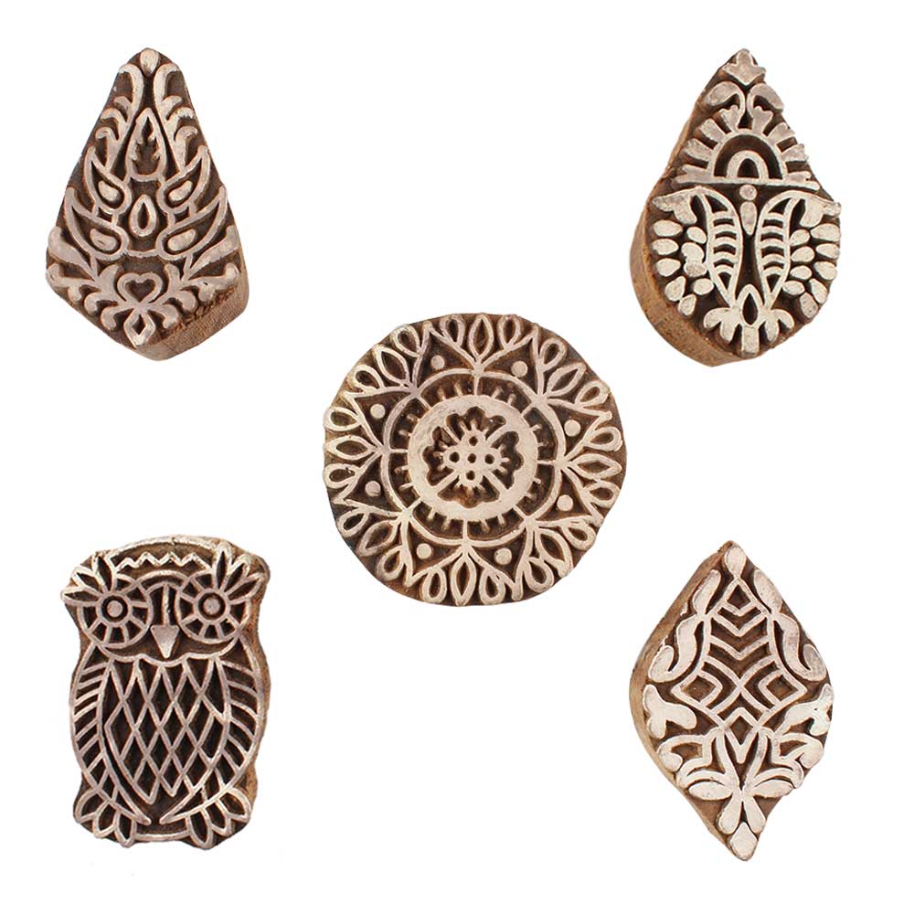 Set of 5 Piece New Mix Wooden Printing Blocks. Ideal for use on Fabric, Paper, Canvas, etc. These Blocks can be use to Print with Oil Colors, Fabric Colors, Water Colors, Acrylic Colors and Vegetable Colors.