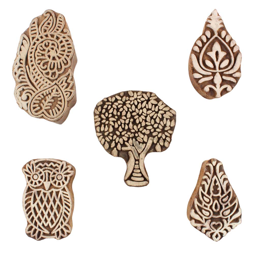 Set of 5 Piece New Mix Wooden Printing Blocks. Ideal for use on Fabric, Paper, Canvas, etc. These Blocks can be use to Print with Oil Colors, Fabric Colors, Water Colors, Acrylic Colors and Vegetable Colors.