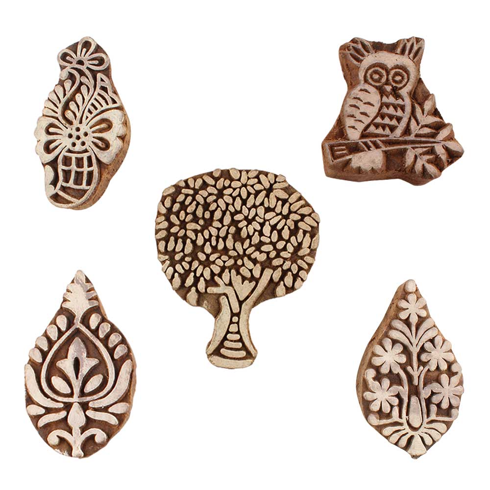Set of 5 Piece New Mix Wooden Printing Blocks. Ideal for use on Fabric, Paper, Canvas, etc. These Blocks can be use to Print with Oil Colors, Fabric Colors, Water Colors, Acrylic Colors and Vegetable Colors.