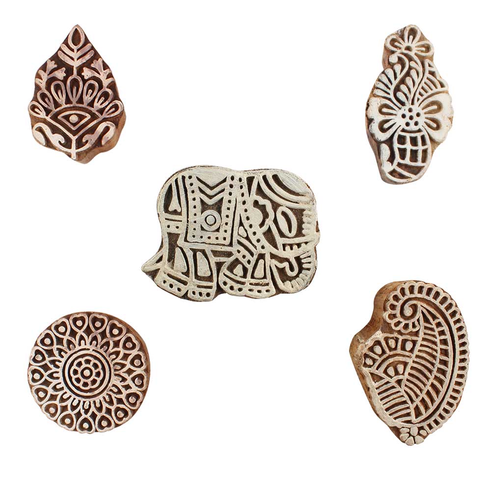 Set of 5 Piece New Mix Wooden Printing Blocks. Ideal for use on Fabric, Paper, Canvas, etc. These Blocks can be use to Print with Oil Colors, Fabric Colors, Water Colors, Acrylic Colors and Vegetable Colors.