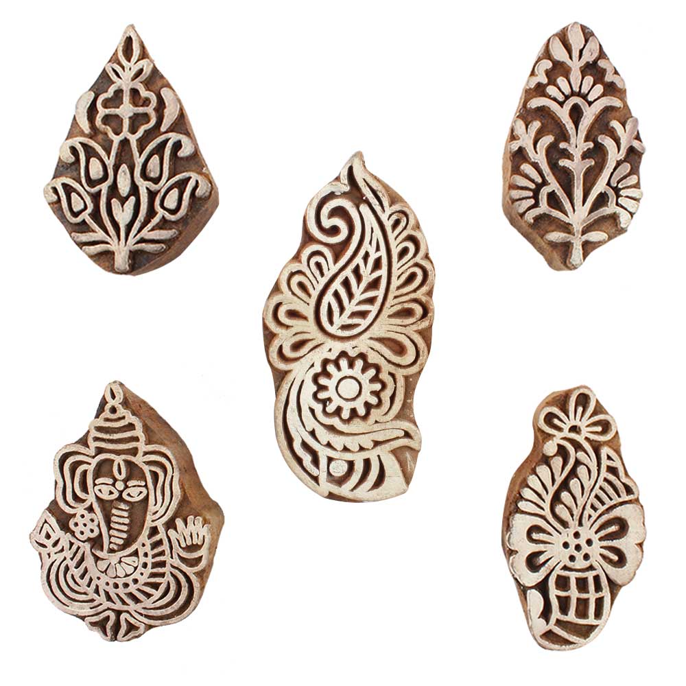 Set of 5 Piece New Mix Wooden Printing Blocks. Ideal for use on Fabric, Paper, Canvas, etc. These Blocks can be use to Print with Oil Colors, Fabric Colors, Water Colors, Acrylic Colors and Vegetable Colors.