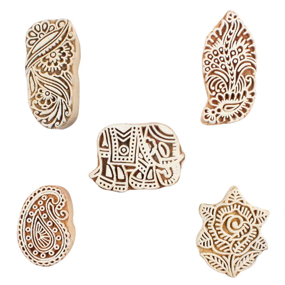 Set of 5 Piece New Mix Wooden Printing Blocks. Ideal for use on Fabric, Paper, Canvas, etc. These Blocks can be use to Print with Oil Colors, Fabric Colors, Water Colors, Acrylic Colors and Vegetable Colors.