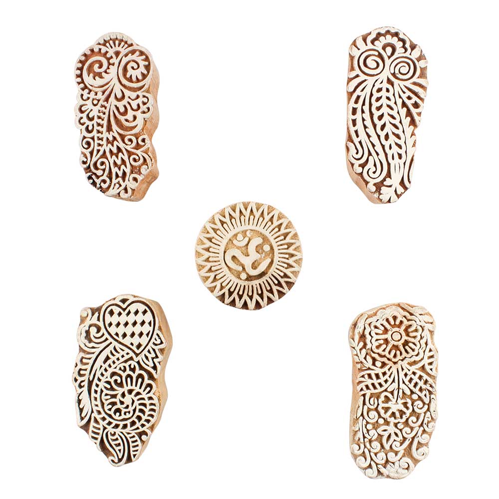 Set of 5 Piece New Mix Wooden Printing Blocks. Ideal for use on Fabric, Paper, Canvas, etc. These Blocks can be use to Print with Oil Colors, Fabric Colors, Water Colors, Acrylic Colors and Vegetable Colors.