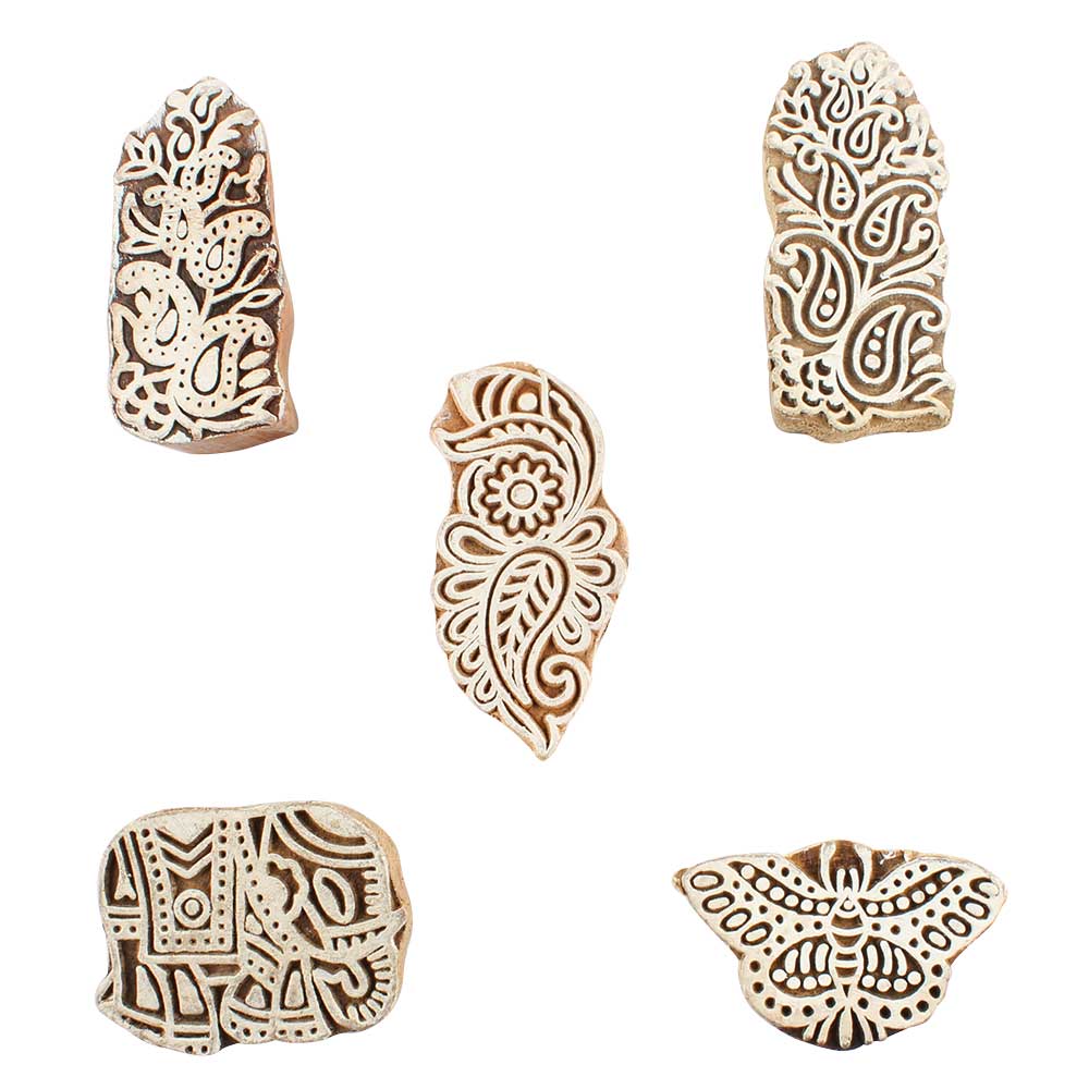 Set of 5 Piece New Mix Wooden Printing Blocks. Ideal for use on Fabric, Paper, Canvas, etc. These Blocks can be use to Print with Oil Colors, Fabric Colors, Water Colors, Acrylic Colors and Vegetable Colors.