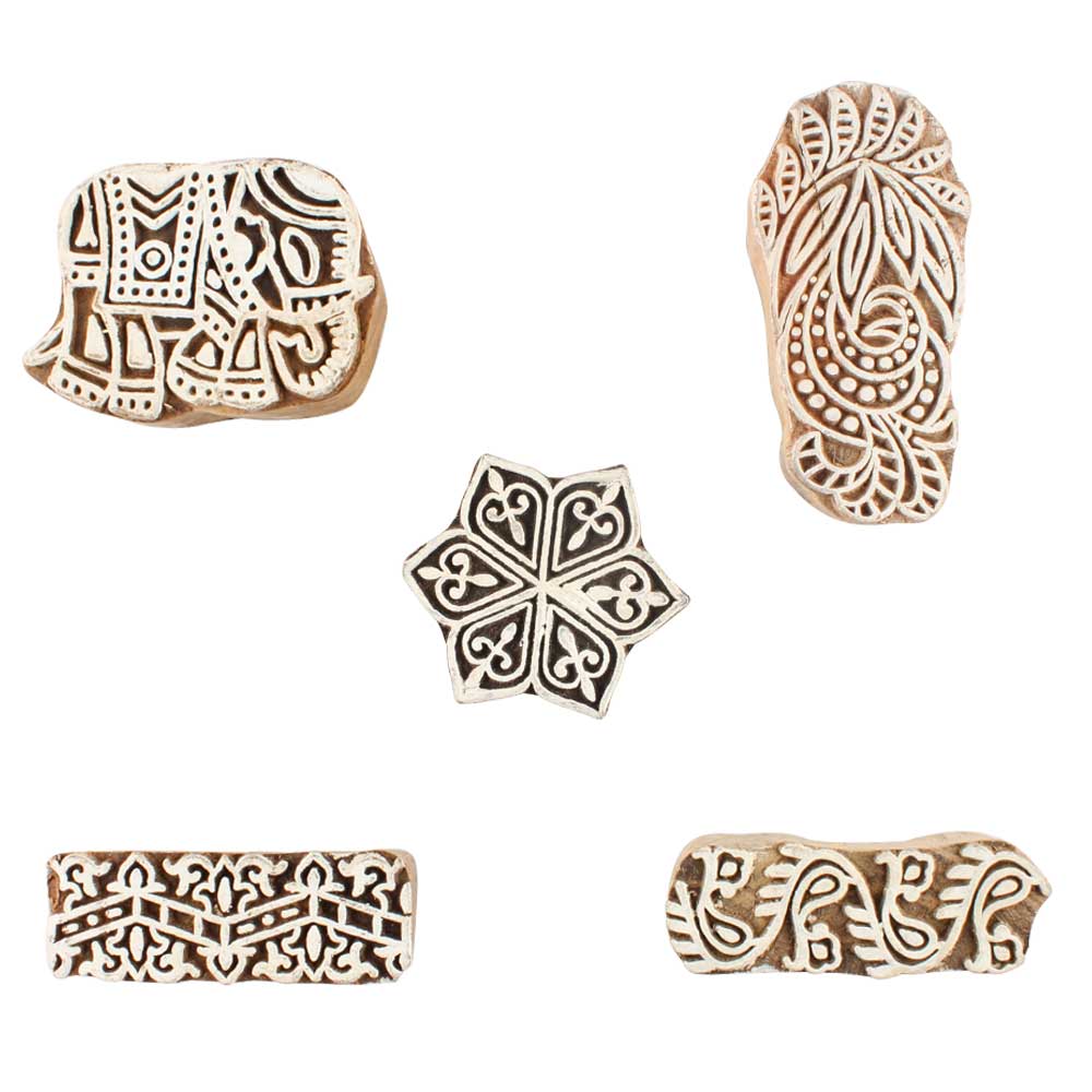 Set of 5 Piece New Mix Wooden Printing Blocks. Ideal for use on Fabric, Paper, Canvas, etc. These Blocks can be use to Print with Oil Colors, Fabric Colors, Water Colors, Acrylic Colors and Vegetable Colors.