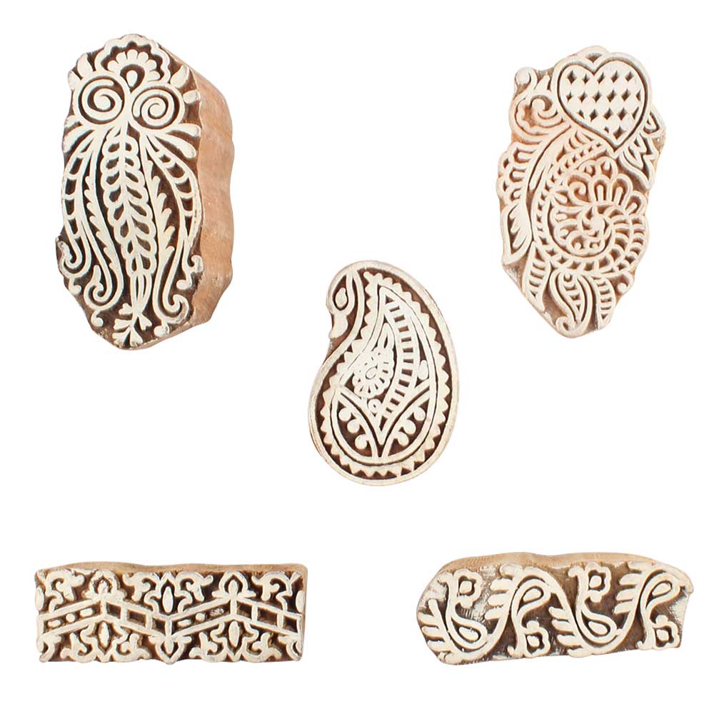 Set of 5 Piece New Mix Wooden Printing Blocks. Ideal for use on Fabric, Paper, Canvas, etc. These Blocks can be use to Print with Oil Colors, Fabric Colors, Water Colors, Acrylic Colors and Vegetable Colors.