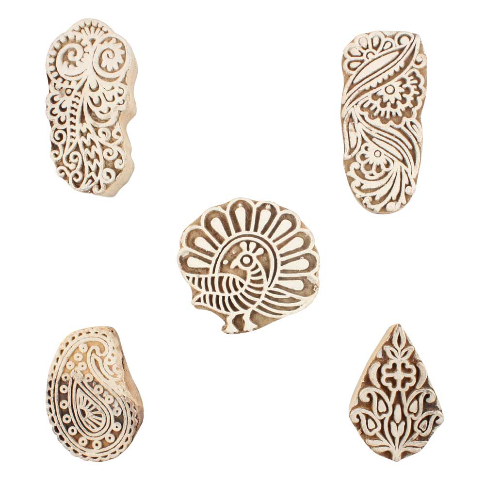Set of 5 Piece New Mix Wooden Printing Blocks. Ideal for use on Fabric, Paper, Canvas, etc. These Blocks can be use to Print with Oil Colors, Fabric Colors, Water Colors, Acrylic Colors and Vegetable Colors.