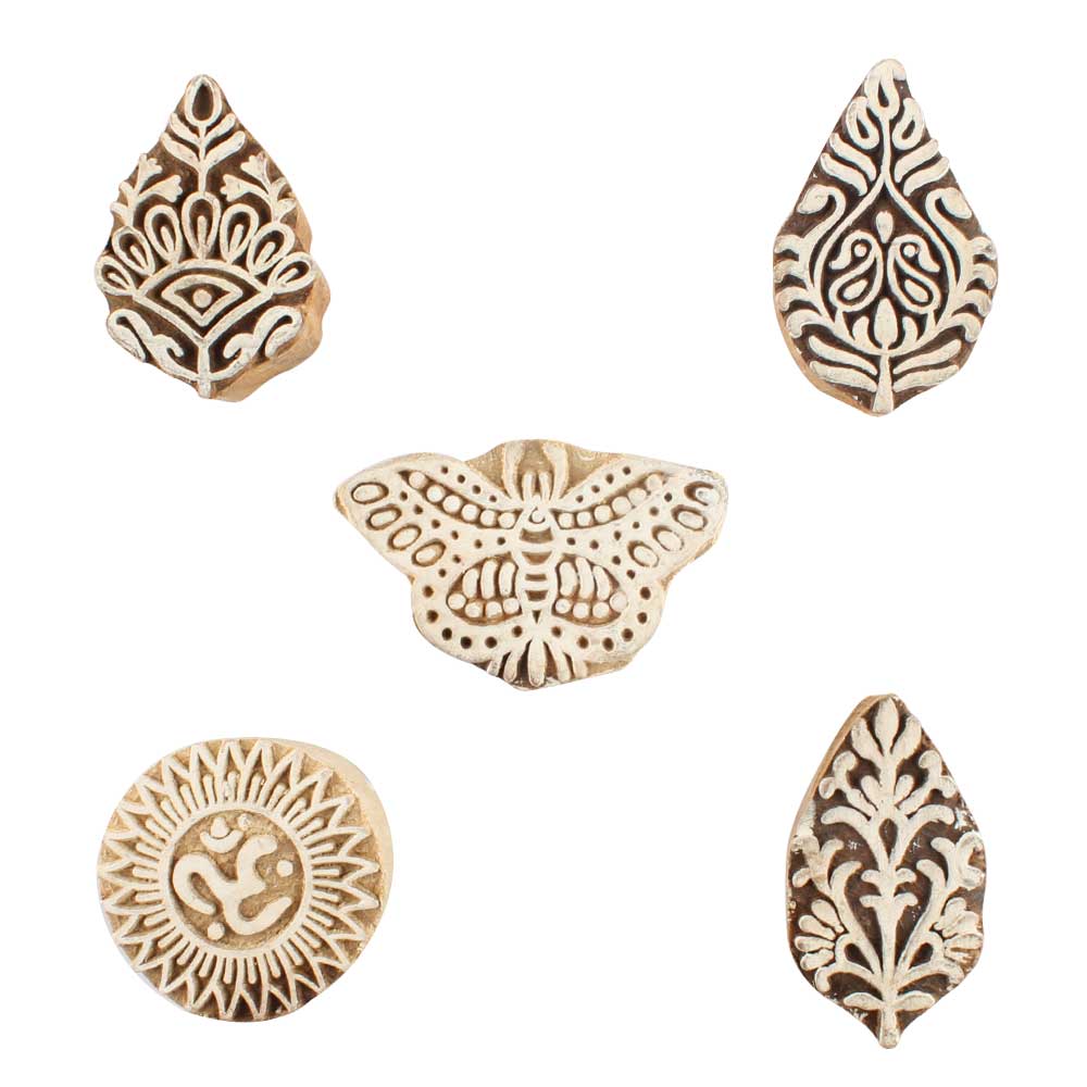 Set of 5 Piece New Mix Wooden Printing Blocks. Ideal for use on Fabric, Paper, Canvas, etc. These Blocks can be use to Print with Oil Colors, Fabric Colors, Water Colors, Acrylic Colors and Vegetable Colors.