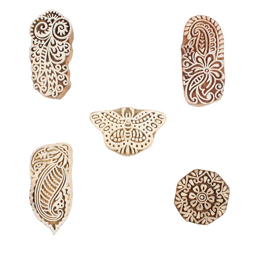 Set of 5 Piece New Mix Wooden Printing Blocks. Ideal for use on Fabric, Paper, Canvas, etc. These Blocks can be use to Print with Oil Colors, Fabric Colors, Water Colors, Acrylic Colors and Vegetable Colors.